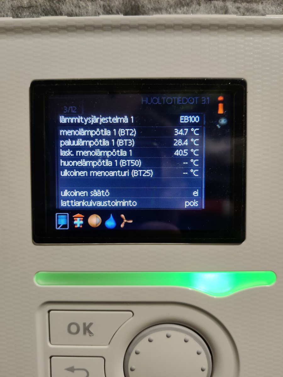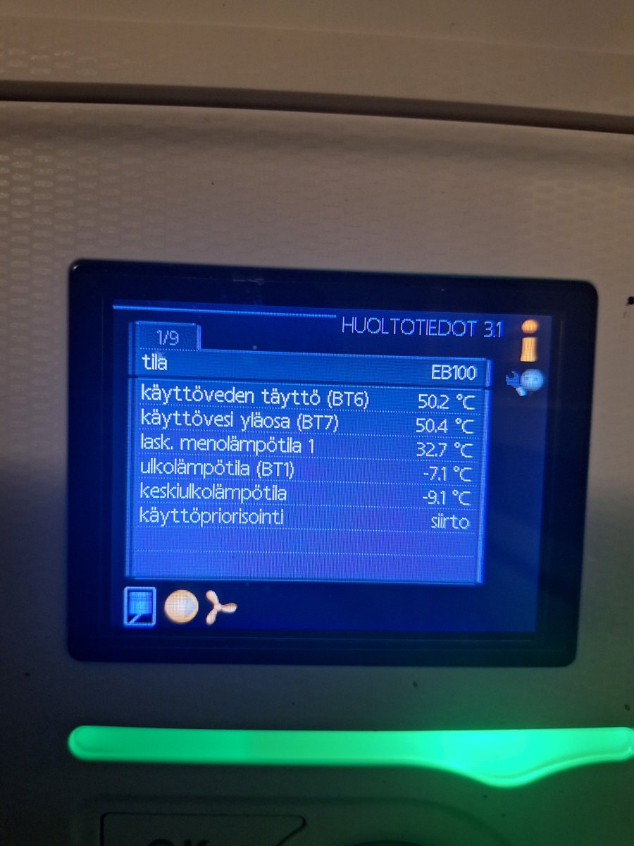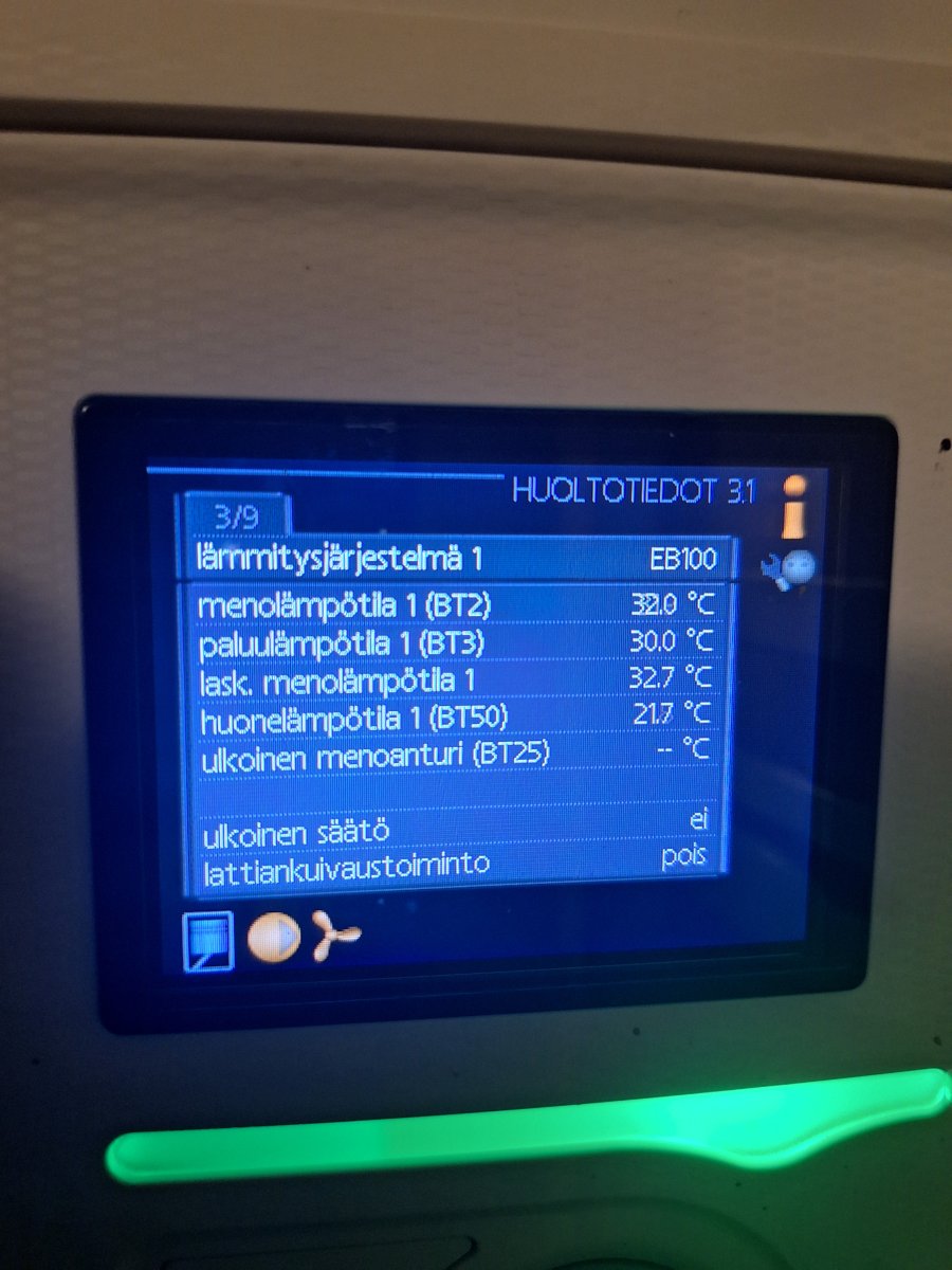No niin. Mielenkiintoista. Nyt kun on ollut lauhaa +5... -2C), niin Nibe toimii hyvin kunhan päivällä on lämpimän veden kulutusta. Eli kompura käynnistyy tarvittaessa ja 2kW lisäystä. Mutta esimerkiksi eilen kun vettä ei käytetty, niin myöhään illalla laite olikin mennyt vikatilaan (#51) + menovesi +24C ja kompura ja laite pysyi päällä vasta kun sulki lattiakierron kraanasta ja piti 15 minuuttia konetta keltaisella että vesi lämpesi. Sen jälkeen moitteeton käynnistys (menovesi +29C) ja lattiakiertoventtiili auki ja laite on siitä asti taas toiminut kuten kuuluu. Nyt seuraavana päivänä uinuu ja kompura käynnistyy kun lämmintä vettä käytetään. Onko nyt siis niin että paketti kylmenee niin paljon päivällä, että lisäys ei ehdi vaikuttamaan riittävästi ennen kuin kone havahtuu jäätymisriskiin, koska iso osa lämmöstä lähtee lattiaan ja viileää takaisin säiliöön? Lisäystä ei ole estetty, mutta lämpö on säädetty nollaan päivällä ja yöllä +3 koska tavoitteena ladata lattiaan öisin lämpöä.