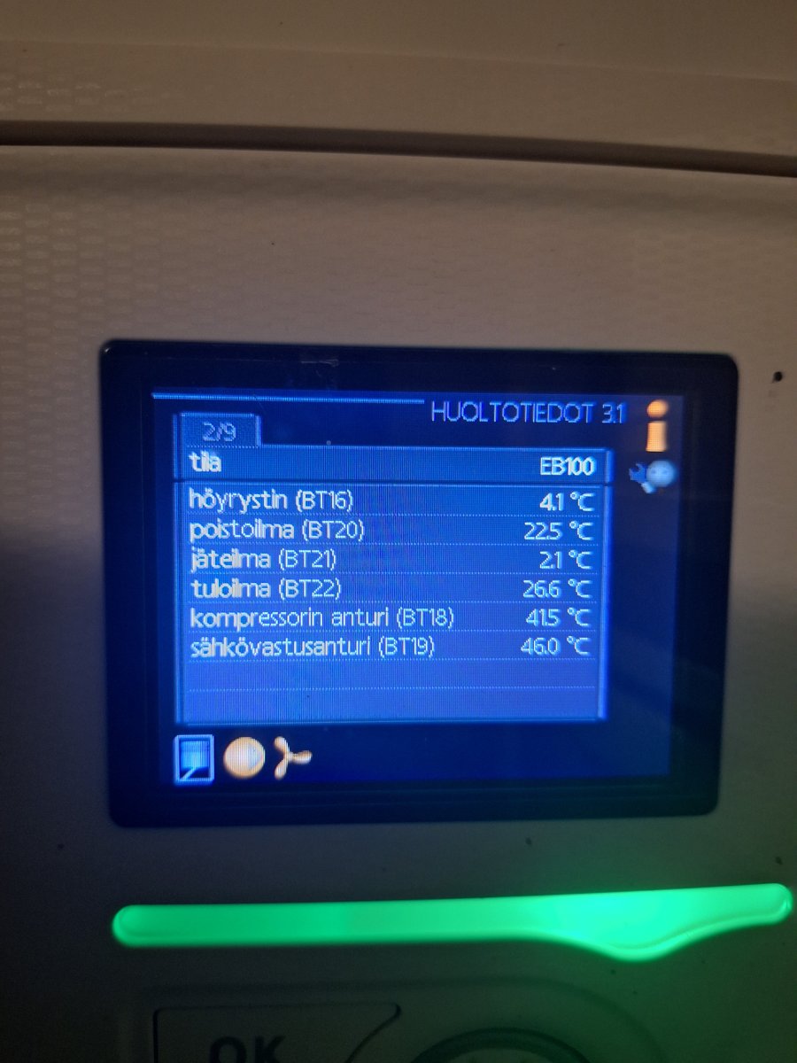 Ja nyt tapahtui sama, että laite jäi vikatilaan. Meno/paluuvesi +24C ja veden lämpötila +44C. Aamulla käynnistyi nätisti levosta, mutta nyt ei toistamiseen. Kokeilin nyt niin, että olin sulkenut lattiakierron kokonaan pois putkiston kraanasta eli vesi kiersi vain Nibessä. Millaisia säätöjä pitäisi tehdä, että kone käynnistyisi varmasti? Kai tämä johtuu liian alhaisesta veden lämpötilasta eli kone pelkää jäätymistä vaikka lämpöä on ja ulkona nollan tuntumassa.