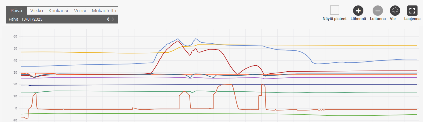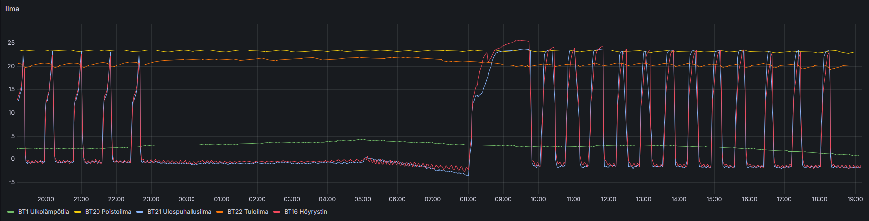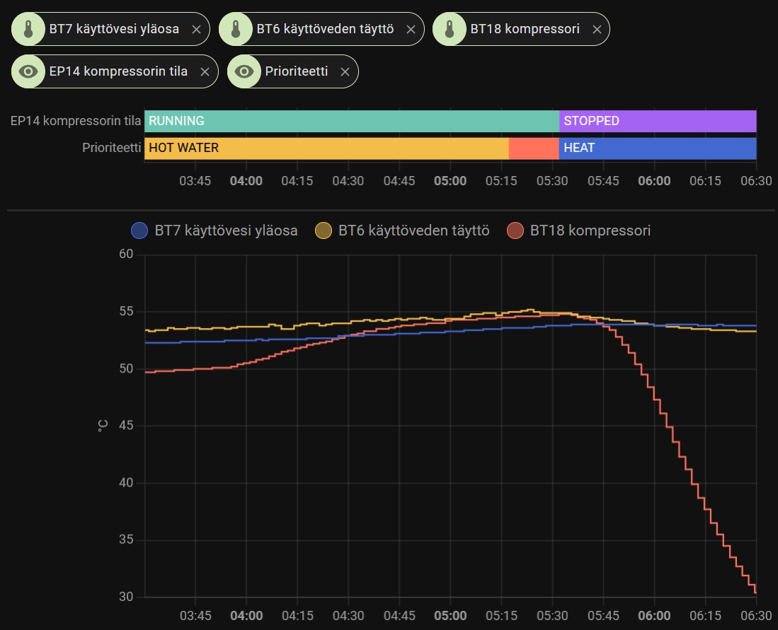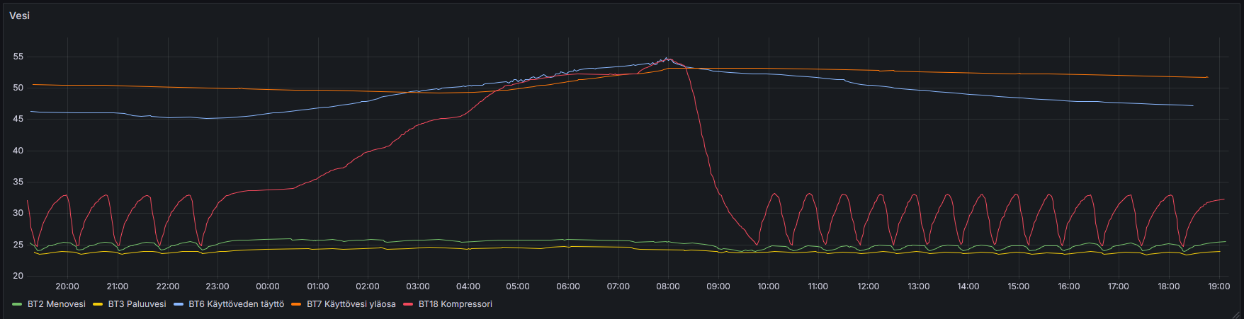 Katsoin vanhempaa dataa, niin minulla oli käyttövedellä ajastus, että 8-23 pois, niin BT6 anturi alkanut nousemaan siinä 23 aikaan kun alkanut lämmittämään käyttövettä. Tippunut aikaisemmin sinne 25-27C päivittäin ja 23 aikaan alkanut nostamaan 53C. Yläosa ollut alimmillaan 45C.