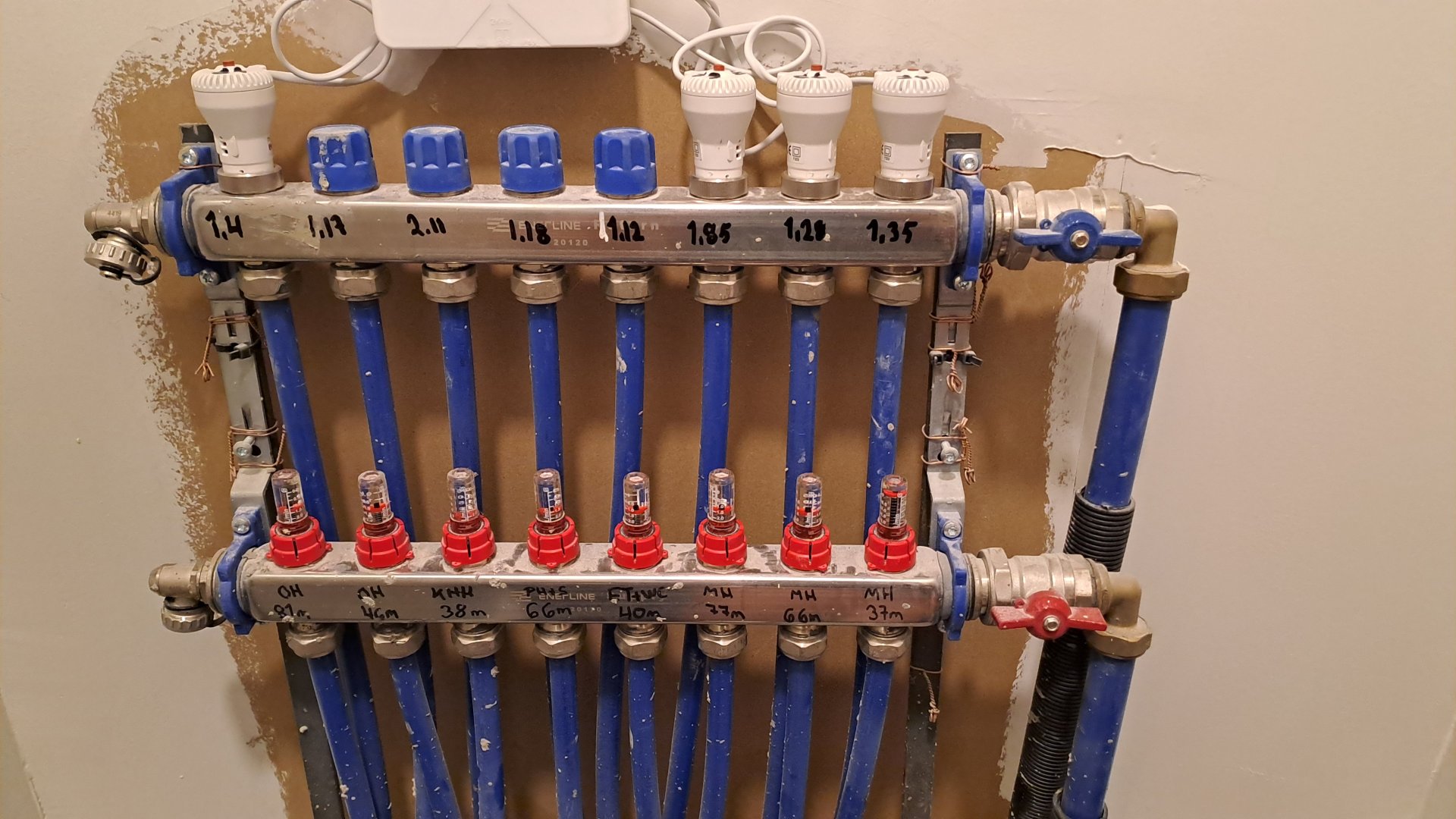 Sainpa sitten taas uutta mietittävää kun mielessä kävi tuo kylppärin lämpötila niin kävin raivaamassa roinat ja jakotukin suojan veks ja uskalsin ensimmäistä kertaa tutkia jakotukkia. Työhuoneen toimintalaite sökönä, ja asentajalla mennyt myös yhdessä piirissä paineet ja virtaukset sekaisin. Niin pitäisi tuotakin sitten käydä muuttamassa.