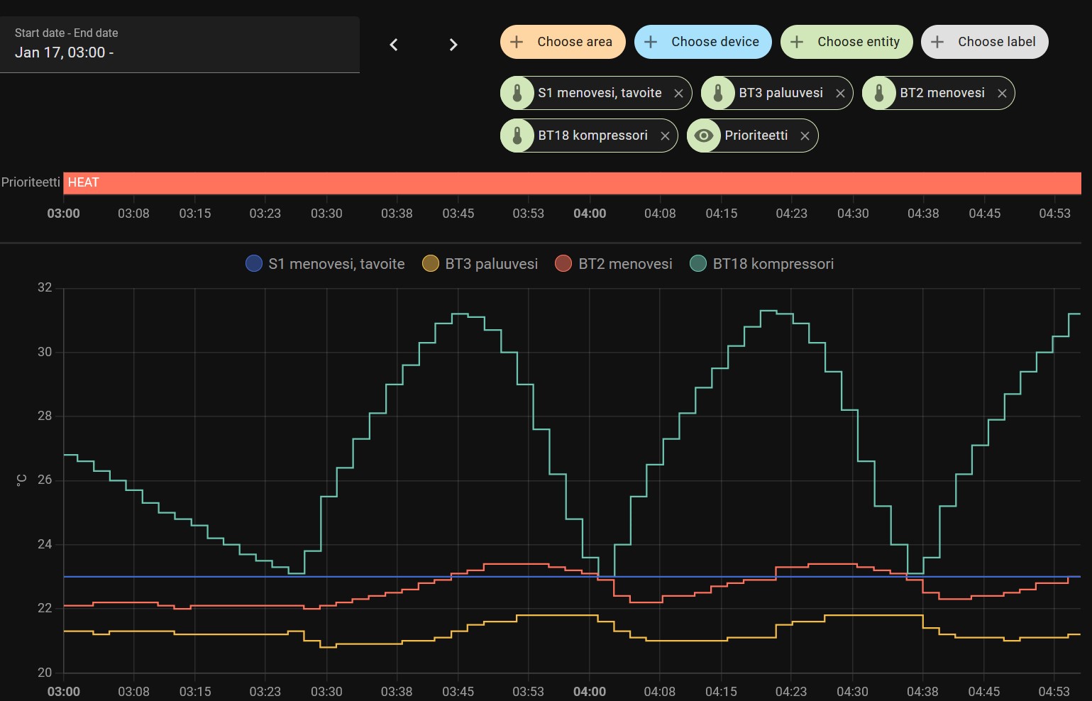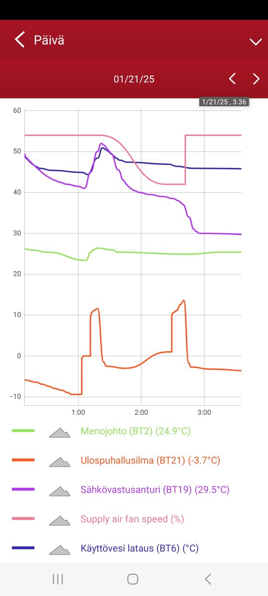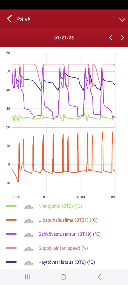 Katselin eilen että lähti 23 nostamaan tuota BT6 anturia sinne 36C mutta tapahtui todella hitaasti. Lähtö oli siinä 26C kohdalla. Ei kuitenkaan lämmittänyt mitään käyttövettä. Käyttövesi laski yön aikana 46C 42C.