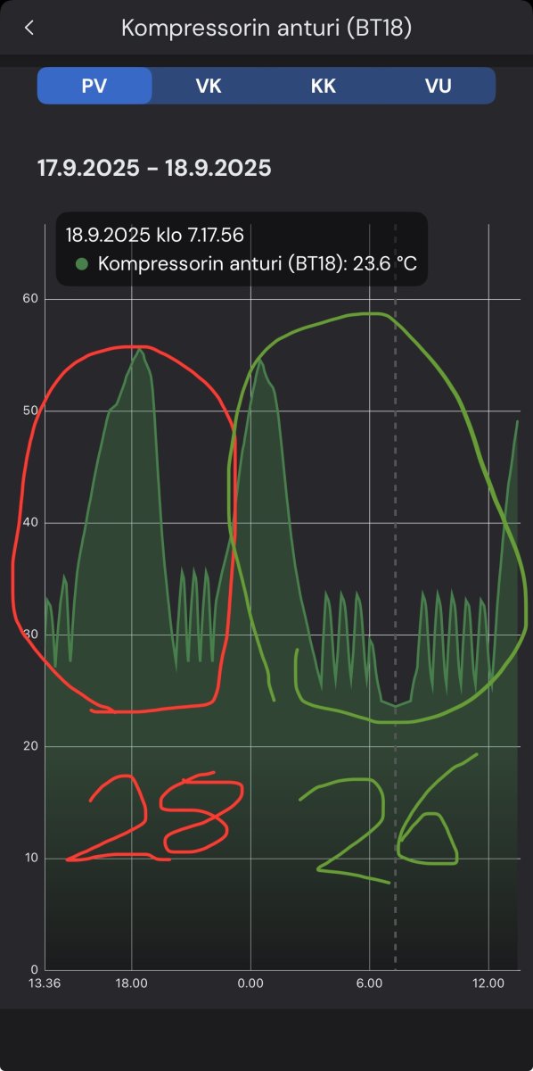Täytyy koneella viekä ottaa paremmin mutta mulla kyllä kompressorin anturi bt18 tippuu ihan hetkessä 2-3h, kuvassa 28 ja 26 alueet eiliseltä illalta ja viime yöltä. 28 menolla tippuminen kesti 18:22-20:13 ja 26 menolla 00:28-3:33.