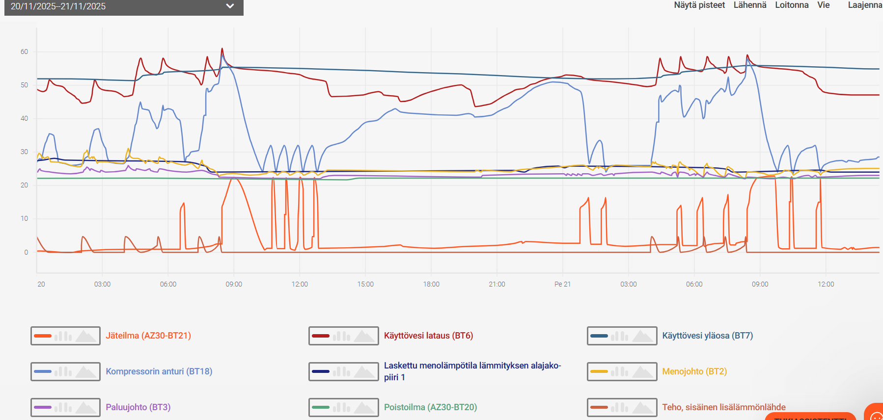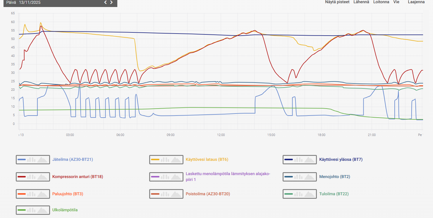 EDIT. Tuossa vielä käppyrää tältä alkuviikolta. Tänään Ti 18.11 klo 7.00 aikoihin käyttöveden täyttö laskenut yhtäkkiä aika radikaalisti 53 asteesta 40 asteeseeb reilussa 10 minuutissa. Mikähän tuon selittää?
