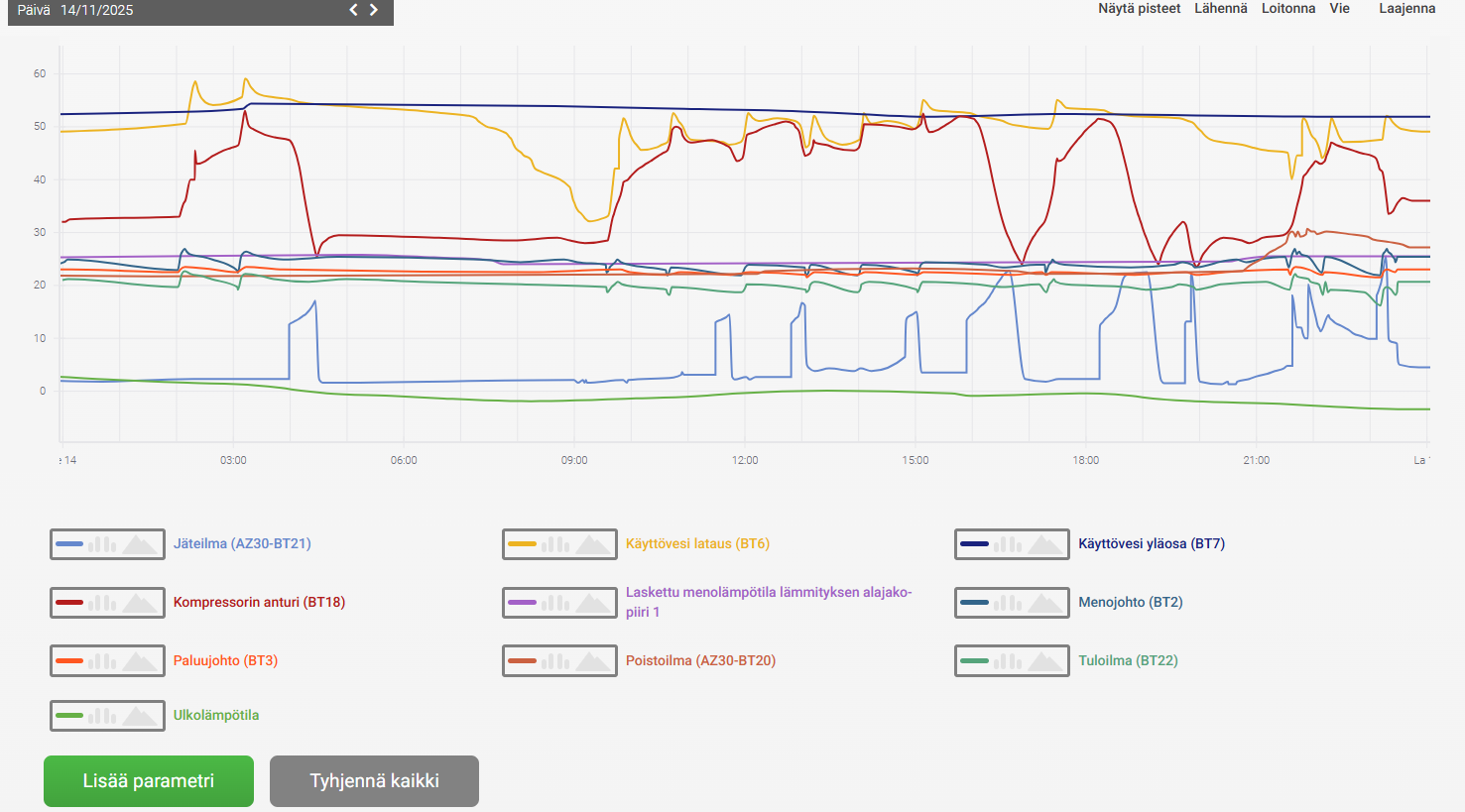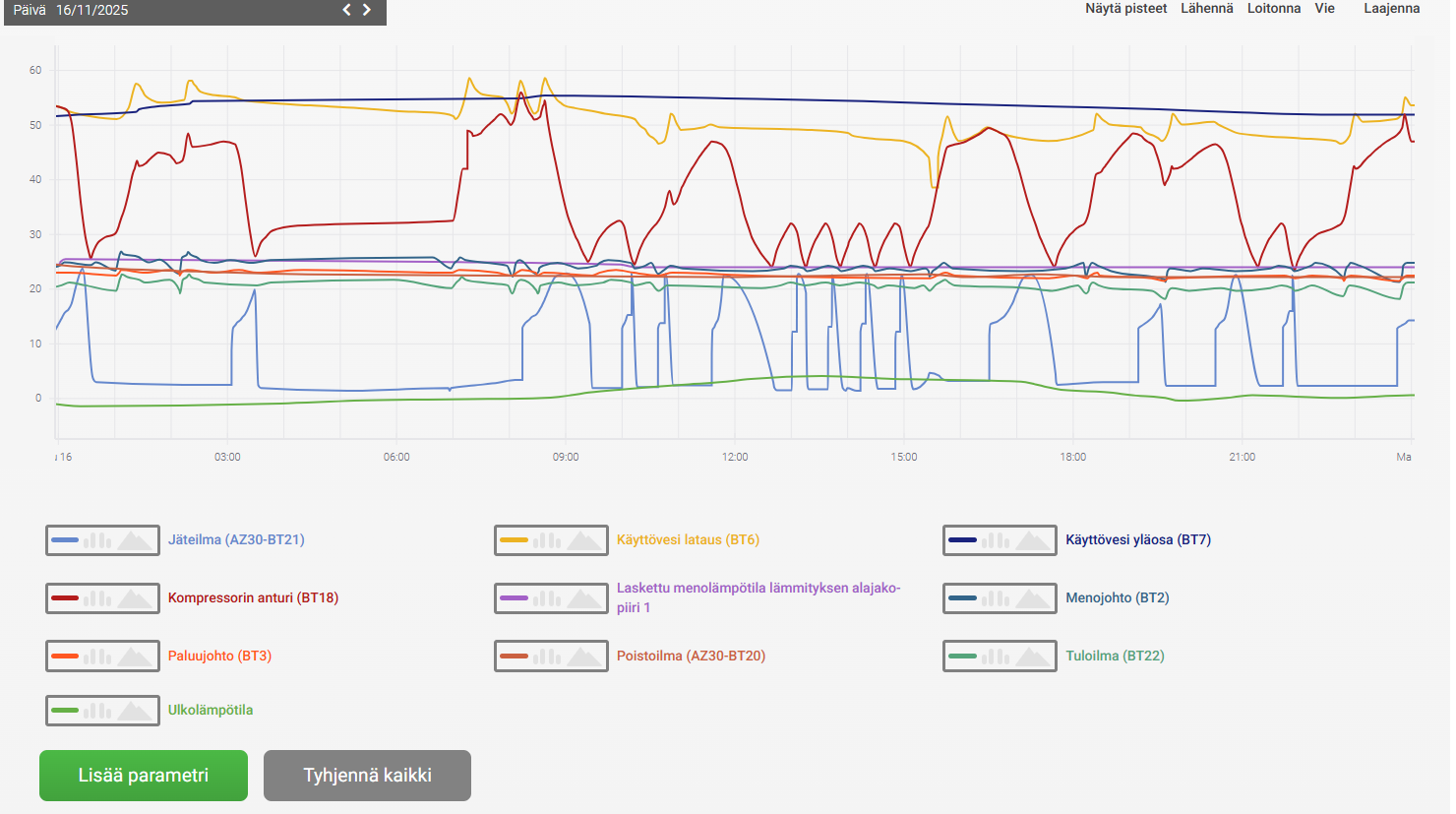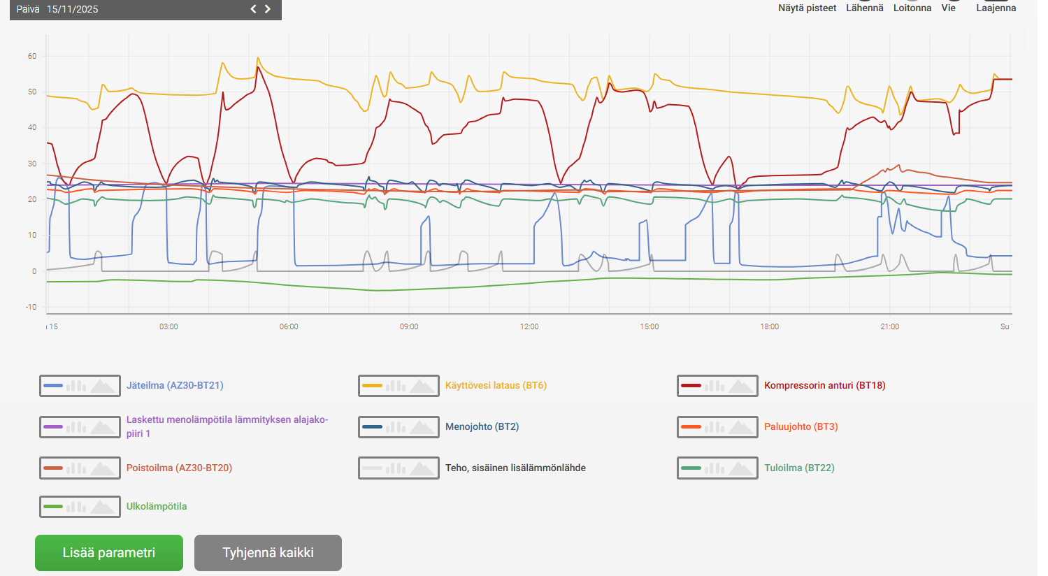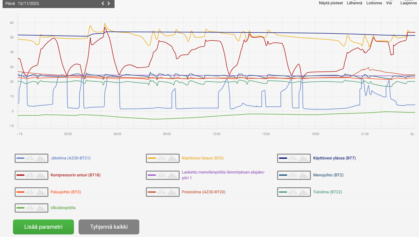 Liitteenä käppyröitä muutamalta viimepäivältä, lisäksi 15.11.2025 käppyrä, jossa näkee vastusten käyttöä. Onko käyrissä mielestänne jotain huomautettavaa/korjattavaa?