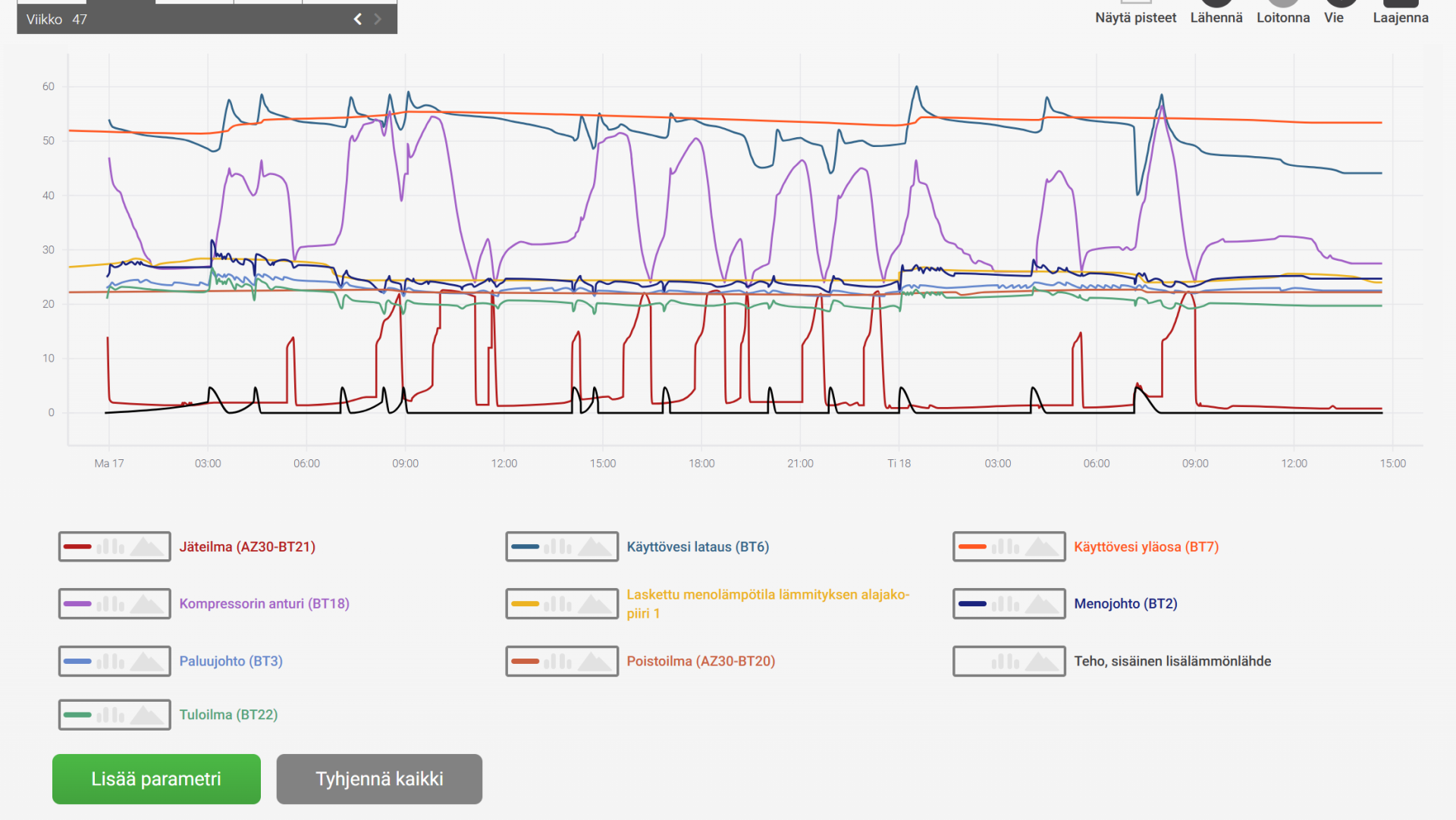 Tässä kuvassa myös vastusten käyttöä. Ihmetyttää että vaikak kompura käy silloin tällön niin vastuksia käytetään aika paljon päällä ja sitten taas kompura lepäilee. Kannattaisiko estää vastusten käyttö vaikka 0 asteeseen jos sillä saa kompressorille enemmän töitä?