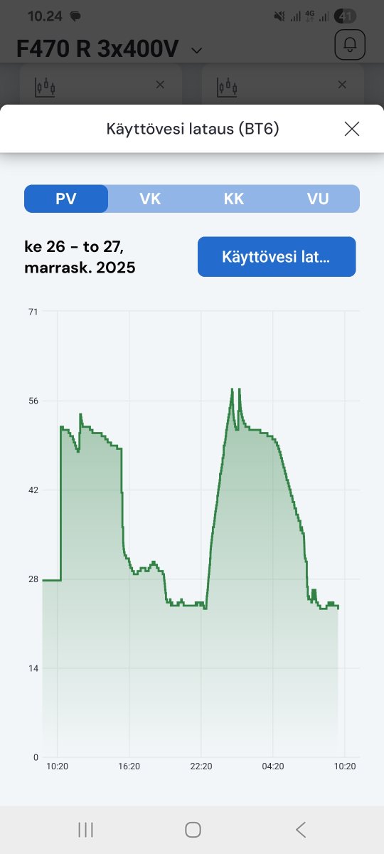 Vielä haluisin kysyä käyttöveden lämmityksestä. Eilen illalla oli käyttöveden lämpö suihkujen jälkeen melko matalalla ja ajattelin, että laitetaan yöksi tilapäinen 3h luksus päälle jotta yöllä tekee halvalla sähköllä lämpimän veden. No tekihän se mutta vaikka kukaan ei ole yöllä/aamulla suihkussa käynytkään niin BT6 lämpö on sama aamulla kuin mitä se oli illalla ennen luksusten aktivointia. Tokihan lämpöä on siirtynyt tuonne yläanturille ja se on toki noin 10 astetta lämpimämpi, kiitos yöllisen lämmityksen.