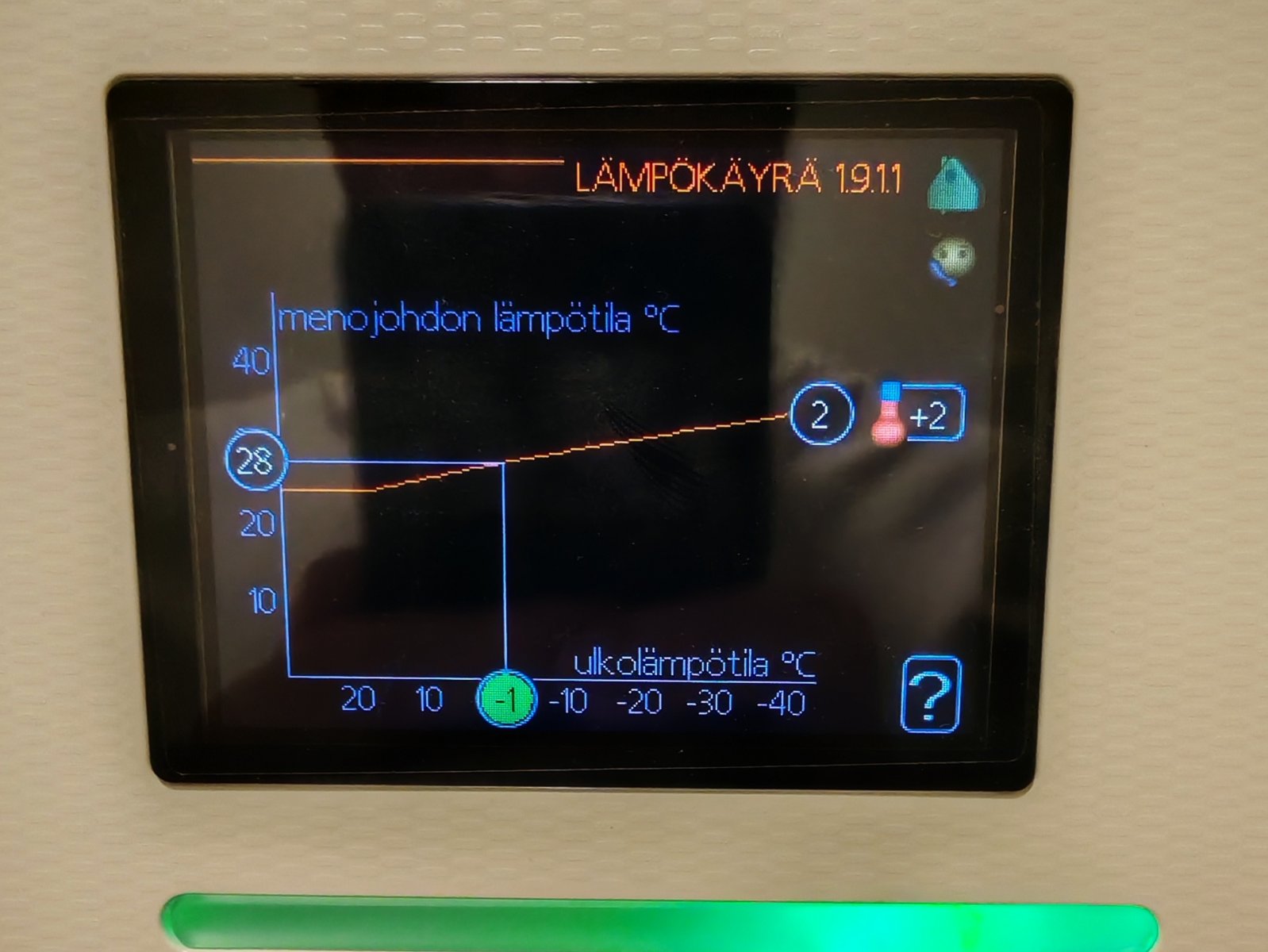 Ja siis tosiaan koneelta kun käy säätämässä niin ei ole vaikutusta tuohon kakkoskäyrään, siinä on ihan 2+2 valittuna samoin mobiilissa. Lämmitys ei siltikään seuraa tuota käyrää.