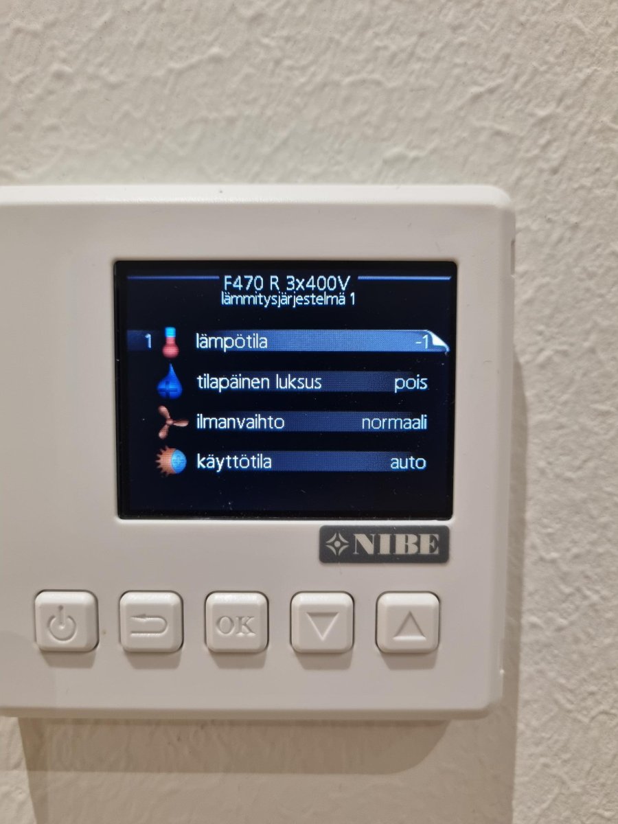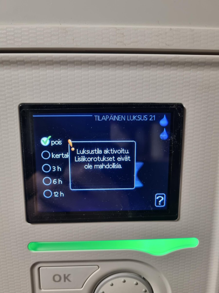 Tänään aamulla töihin lähtiessä vilkaisi tuota sisällä olevaa NIBEn näyttöä ja siellä oli luksus -tila päällä. Kun menin rönkkimaan tekniseen tilaan itse laitetta niin ilmeisesti oli jaksottainen korotus eli legionella lämmitys menossa. Näyttääkö laite sillonkin että luksus on päällä? Itse en tuota luksusta ole päälle laittanut.