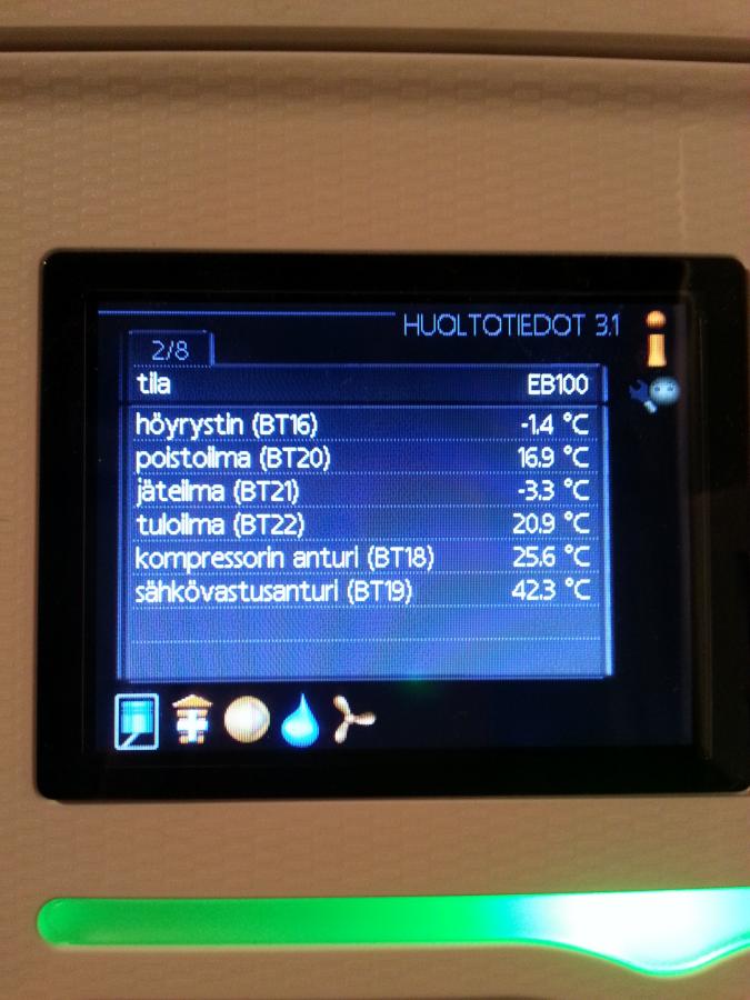 Joo, en vielä nostanu mitään, seuraillaan nyt vielä, 13.1 oli äsken tuloilman lämpö, näky myös olevan vastus päällä 5.5kw, eikä sulatus ollu päällä. Pakkasta -21 astetta.