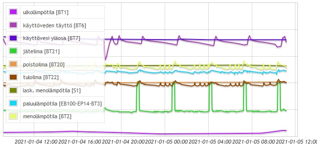 Vähän samaa kysymystä kun aikasemmin, mutta erilaisilla käppyröillä kun on tuhdimmat pakkaset. Mulla pääosin viistää menovesi jopa muutaman asteen alle laskennallisen, vaikka suodatusaikakin tullut täyteen kun pitemmät pakkaset. Lisäksi tuossa on ennen käyttöveden täyttöä tuota nypytystä yleensä 3 pikkiä. Oon luullu että vastukset tekis vaan tuon isomman lisäyksen kun käyttövettä lämmitetään, mutta tekeekö ne tuon pienemmänkin heijauksen ennen käyttöveden lämmitystä vai mistä se tulee? Onko normaalia? Onko tähän hommaan säätönä yhä lisäyksen tehon tiputtaminen, vai mikä? Kuitenkin vapaankierron tilojen lämpötila sopiva niin sinänsä ei pahempaa ongelmaa....
