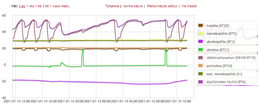 EE: Tulolämpökin näyttää olevan tuolla 14-15c paikkeilla nyt kovemmilla pakkasilla, kun lähempänä nollaa pyöri hieman 20c alla. Milloinhan tuo on liian matala - pakkaselle nyt ainakaan ei saa mennä?