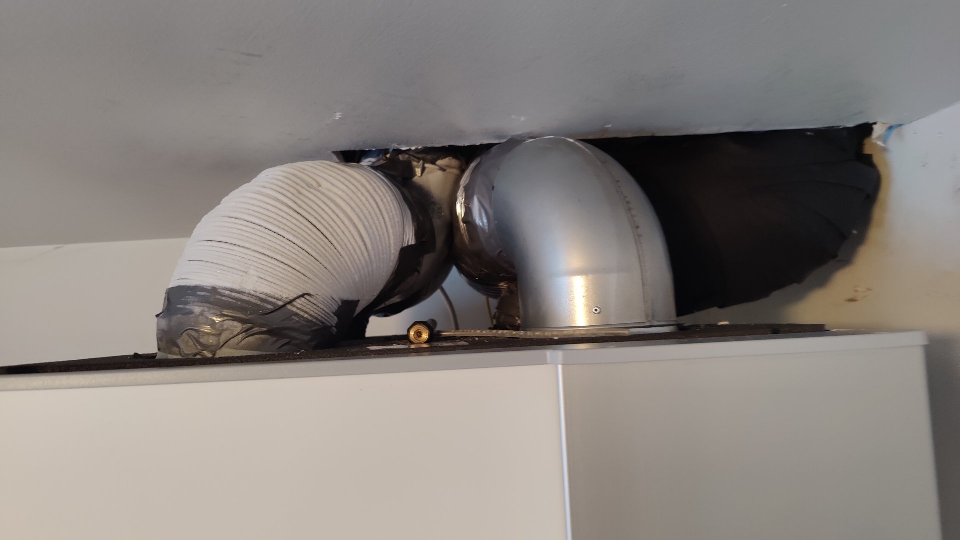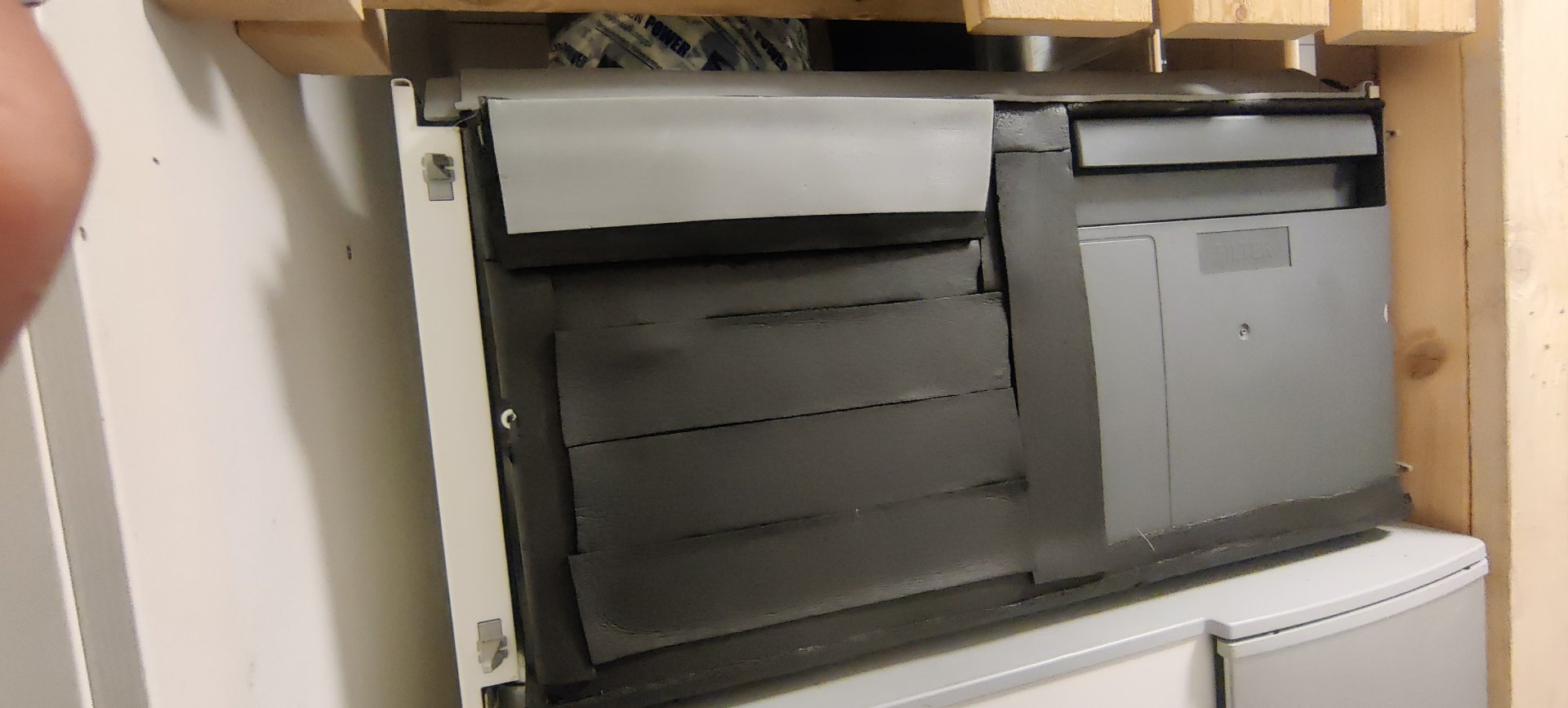 Itse jätin tuon yläluukun kokonaan pois, oli tarkoitus myös eristellä sitä armaflex-teipillä, mutta en saanut aikaisiksi eikä lopulta ollut tarpeenkaan. Vettä valui meilläkin tuosta, päädyin tiivistämään tuota massalla ja tein varmuudeksi tuon harmaan muovilootan alareunaan ruuvien kohdalta reitin sulamisvedelle niin, ettei ne mene koneen sisään.