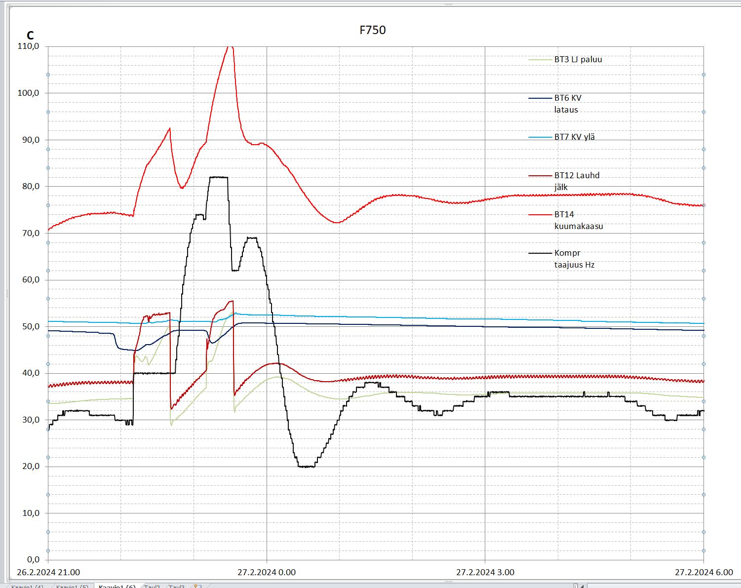 Toi ei oikein onnistu F750:llä, koska talvella, kun on jatkuva lämmitys päällä (eli kone tekee lämmitystä 24/7, paitsi käyttöveden teon ajan), niin se kone nostaa hertsit aina käyttöveden teon ajaksi +20hz verrattuna siihen, mikä oli lämmityshertsit kun moodi vaihtuu lämmityksestä käyttöveden tekoon.