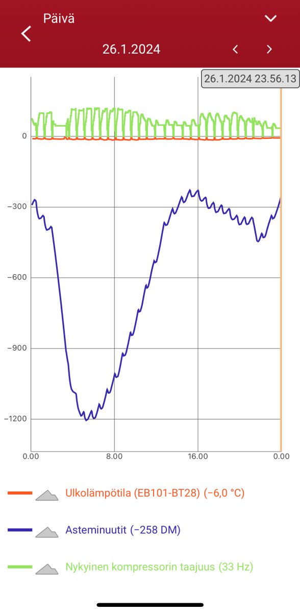Nyt Tammi-helmikuussa kolmas jakso ku F2040-12 on pois päältä. Pakkasen takia. Olen havainnut että käynnistettäessä käy pätkää sekä sulattaa herkemmin ja meno-paluu delta on isompi. Samoin näyttää että asteminuutit vaikuttaa (esim. 400 vs 100).