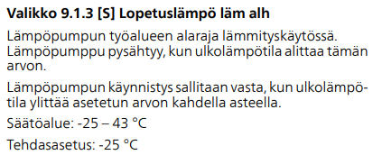 Moro, kaipaisin apua kyseiseen ongelmaan. Kone antaa jo noin -16 asteessa ilmoituksen ”kylmä ulkoilma lämmitys” eli menee vastuksille ja pumppu sammuu. Niben sivuilla mainostetaan että koneen pitäisi pystyä -20 asteeseen asti tuottamaan lämpöä pumpulla. Onko minulla säädöissä jokin pielessä vai mikä homma? Onko kellään käryä asiasta tai samanlaista kokemusta ja pystyykö asialle tekemään mitään?
