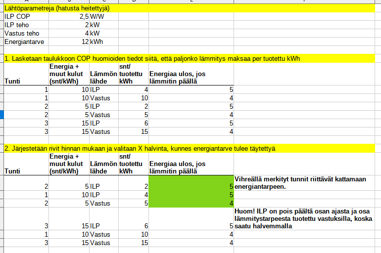 Algoritmini huomioi COPin. Alla nyt taulukkolaskentaohjelmassa raaka esimerkki staattisella COP:lla ja muutenkin hatusta heitetyillä luvuilla (toivottavasti kaavat menivät nyt kerrasta oikein :)) . Tarkoitus esimerkillä ei ollut näyttää, että jossain olemassa olevassa talossa tiettynä päivänä tämä lopputulos olisi oikea vaan toimia algoritmin toimintaa selittävänä. Jos haluaa vaihtuvan COP:n, niin ulkolämpötilasarake mukaan ja jokin laskentakaava, jolla saa muutettua ulkolämpötilan COP:ksi: