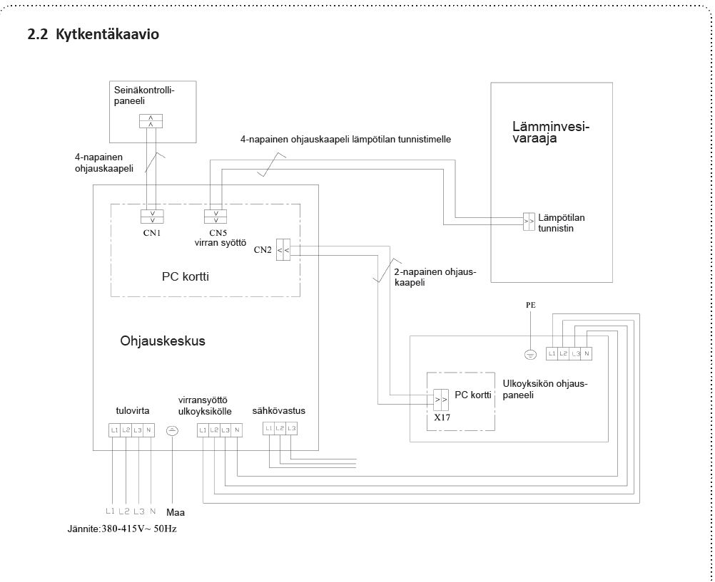 Ohjauskeskuksesta viedään 3 vaiheinen syöttökaapeli ulkoyksikön liittimiin L1,L2,L3,N,Maa.