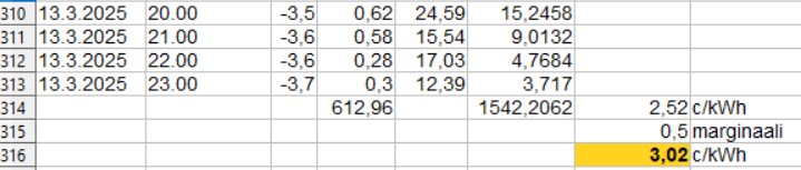 Googlesta:2,29+0,46 snt/kWh eli samaa luokkaa kun ekomiehellä, vai oliko mukana marginaali? Halpaa oli, vaikka välillä vähän hintarallia.