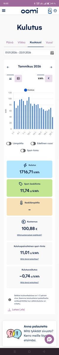 Joo, ei auta mikään varasto jos halvatkin tunnit on 10 snt luokkaa. Mulla 22.1.2026 eli eilinen oma spotti oli 11,74 snt/kWh ja kulutus sen 33 kWh. Mutta ei yksi kk talvea tee vai miten se menikää. Jos tammikuulle olisi ottanut 8 stn kiinityksen niin 3 kertaa 4 olisi voittanut, jos taaksepäin katsoo. Jos asiaa kokeilee niin yksi kerta ei riitä koska voi osua mustapekka. Mutta, koko Euroopassa on ollut kylmää ja kaiketi Suomessa tuullut vähän.