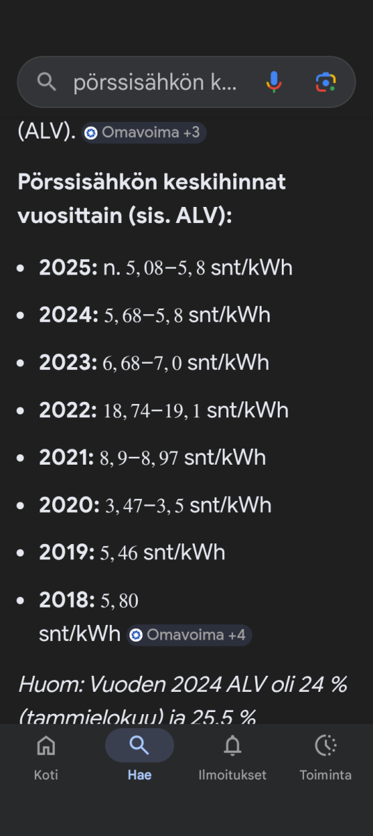 Tai ottanut kiinteähintaisen sähkösopimuksen. Ajatusleikkiä varmaan turha jatkaa.Viisas olisi varmaan tuella ostanut diesel-lämmittimen![]()