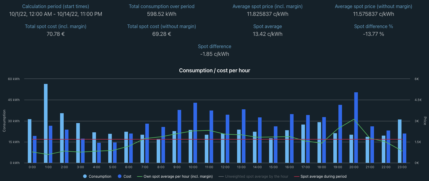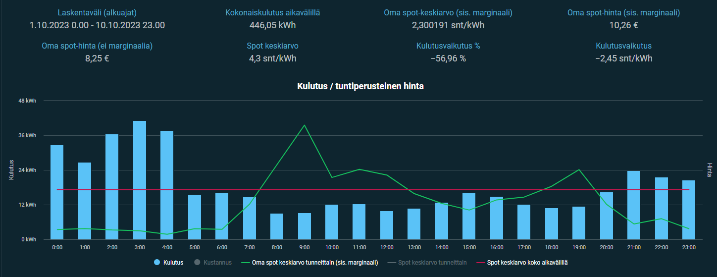 jos ottaa koko vuoden niin se laskee keskiarvohinnan koko jaksolle ja sitä vastaan laskee esim kulutusvaikutuksen.Jaa, kummallista, otin tuossa vuoden -23 ja sitten näkymän syyskuu niin hinta tosiaan poikkeaa luokkaa +1c/kWh.