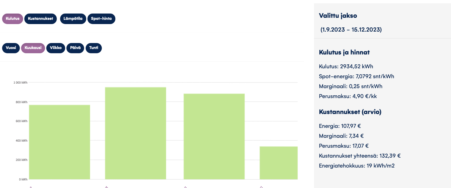 Meill seuraavaa 1.9-15.12.2023Ihan mielenkiinnosta kun asiaa nostat jatkuvasti esille, jos vertaat kulutusta kiinteään 12kk soppariin, itsellä 8.3c/kwh muistaakseni. Niin kuinka isosta erosta puhutaan vaikka tämän vuoden syyskuun alusta tähän päivään? Saat varmaan jostain kokonaiskulutuksen ja kokonaishinnan.