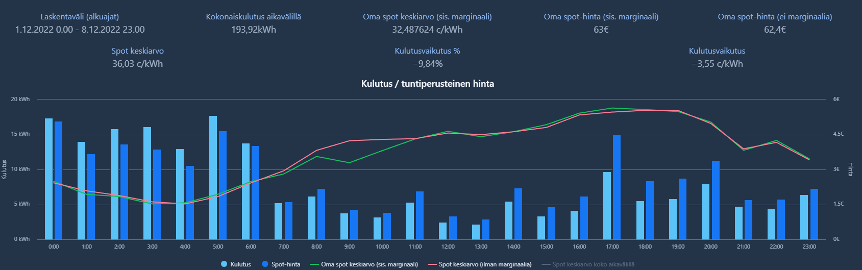 Täällä nyt -5..-10 pakkasilla vuorokausikulutus pyörii 20-25 kWh tietämissä, normaalia elämistä ruuanlaittoineen, suihkussa läträämisine ja tiski/pyykkirumbineen, auto arkiaamuisin vielä lohko+sisälämppäri päällä 1-1,5 tuntia. Tallin teknistä tilaa pitää lämmitellä 500W sähköpatterilla ajastettuna 2 tunnin välein tunnin ajan, pakkasvahtiasennossa. Suurimman osan, eli käyttöveden ja lattialämmityksen onneksi saanut hyvin osumaan ja riittämään aamun halvimmille 6-8 tunnille. Joulukuun ajalta toteutunut spottihinta noin 32,5 kWh, -10% keskiarvoon. Ostin koivuklapia varastot täyteen 100e/1,5 heittomottia, riittänee pariksi vuodeksi, kohta jo maksanut itsensä takaisin eli ensi talvena olisi "ilmaisia puita" taas varastossa :).