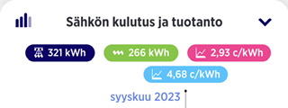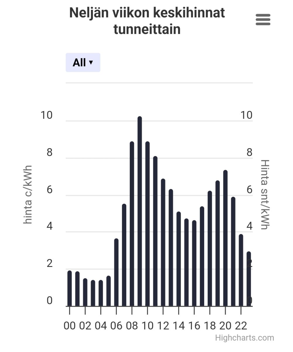 Pystyykö tuota arvioimaan, paljonko aurinkosähköllä on osuutta kulutusvaikutukseen? Eikös nyt ole kalleimmat tunnit olleet yleensä päiväsaikaan, jolloin omalla tuotannolla saa ne väistettyä? Ja samalla tietty ne halvimmat hinnat talteen yöllä kun ei paista.Painui alle kahden sentin. Marginaalin ja Alvin kanssa. 2,36 senttiä / kWh.