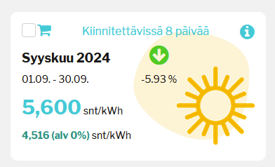 Kiinnityshinta oli viime viikolla jossain 5,7s pinnassa. Jäin odottelemaan josko laskisi alle 5,5. Ehkä ei sinne päästä. Mutta toisaalta, jos syyskuussa menee sähköä 1000kWh, niin 6,3s hinnalla se on 63€ ja sillä 5,7 hinnalla olisi ollut 57€. Lisäksi toki marginaali ja muut kulut päälle ja kulutusvaikutus. Joka tapauksessa puhutaan muutaman euron eroista vielä. Taidan kiinnittää nyt ainakin puolet.