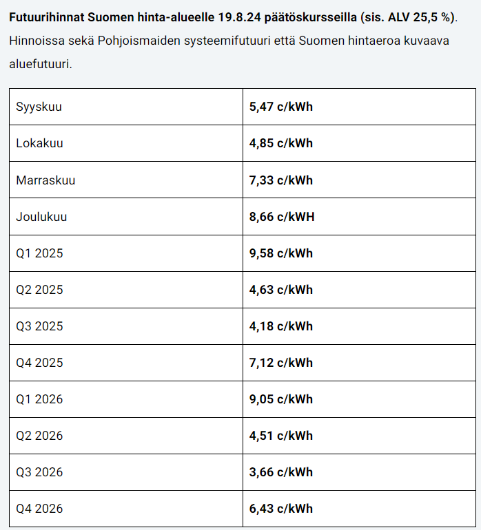 Mutta - keskihinta 5.6 vaatii kalliita öitä. Ja syyskuussa kai tuulee. Jos halvat yöt, niin vaatii 10c päivähintoja. Nähdäänkö niitä?