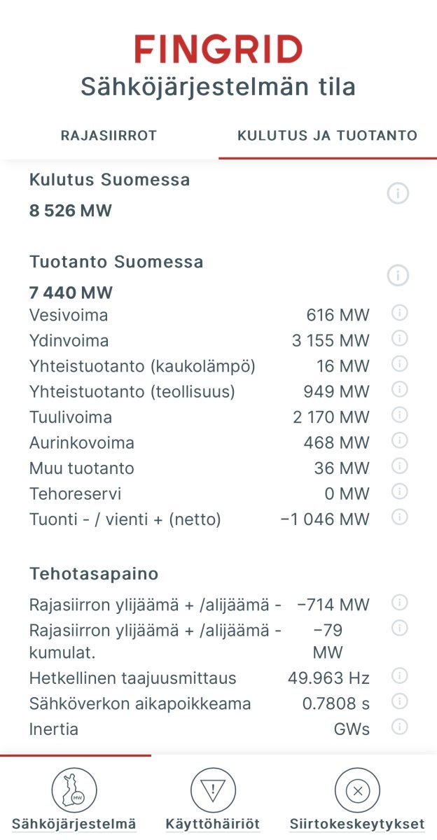 Johtuisiko ainakin osa porrasmaisesta säätämisestä siitä, että tuulipuistoja pysähtyy tuulen nopeuden noustessa liian suureksi. Tuolla Pohjanlahden rannikollahan ollaan ainakin tällä hetkellä paikoin lukemissa, jossa aletaan mennä yli voimaloiden kestorajojen.