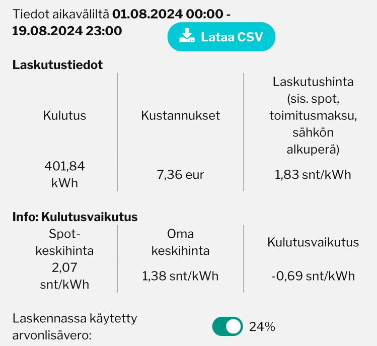 Ite totesin että aika paljon saa halventua vielä että kannattais, tosiaan kun lämmitykseen menevä energia on sen verran pientä. Vähän jopa kaduttaa Q4 kiinnitys jo, mutta sen nyt näkee sitten että mitä tuleman pitää. Q1 saisi tulla aika reippaasti alas vielä että nappaisin, houkuttelevammalta melkein kuulostaa erillinen tammikuun kiinnitys, helmikuu oli jo selvästi halvempi tänäkin vuonna ja katsoin että viime vuodon kulutuksilla tammikuusa ois tullut vähän takkin pörssillä, mutta helmi-maaliskuussa pörssillä olisi jo ollut halvempaa. Toki vuodet ei varmasti oo identtisiä.