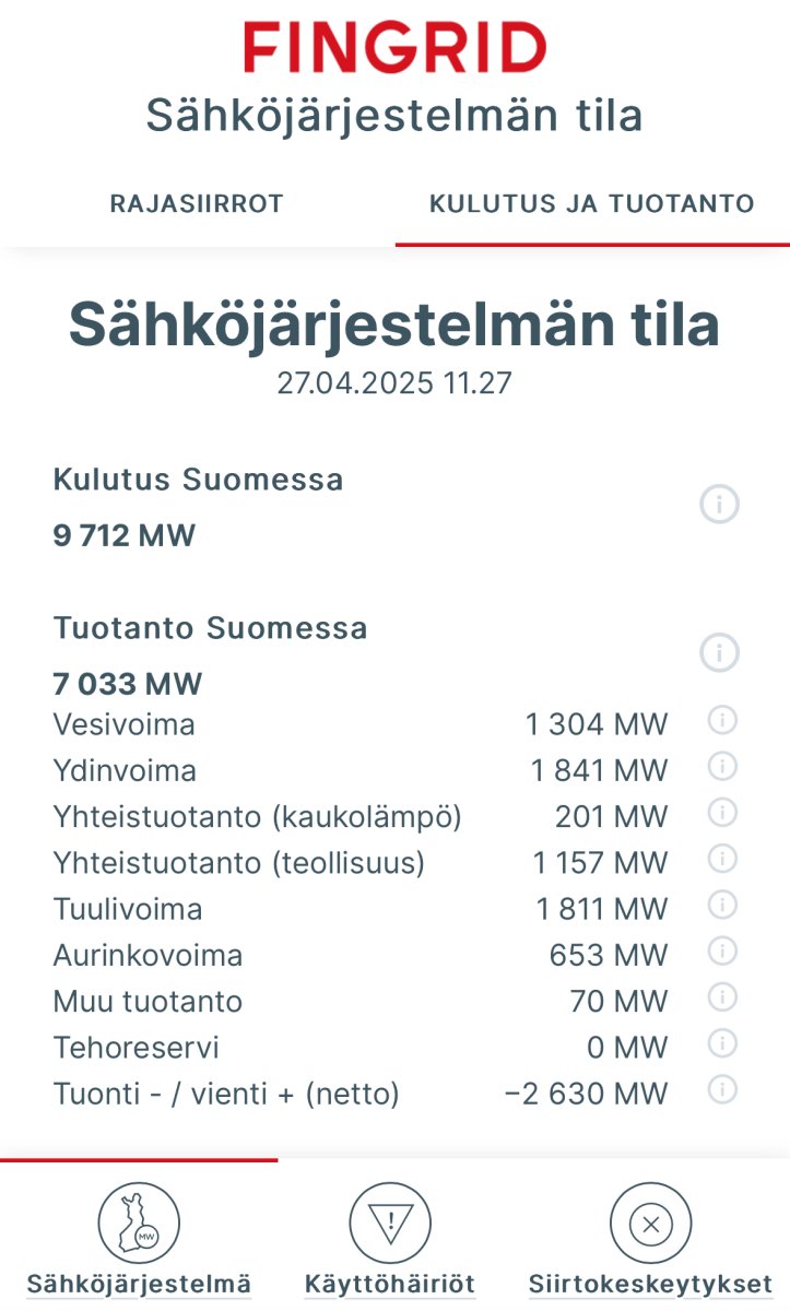 Tuossa muuten on vahvistus epäilylle, että noita laitoiksia käynnistettiin, vaikken väitäkään, että nuo olisivat ratkaisseet hinnan, https://energy-charts.info/charts/power/chart.htm?l=en&c=FI&year=2025&week=17&source=fossil_gas_unit. Valitettavasti tuon saksalaisen muuten ansiokkaan saitin laitoskohtaiset tiedot laahaavat lähes viikon verran jäljessä ennen päivittymistään.Varmaan Helen on käynnistellyt kaasuturbiineja Vuosaaressa (hukkalämpö myydään kaukolämpönä)? Ulkomailta tuskin saa siirretyksi lisää kovin paljon, kun sähköstä on muuallakin niukkuutta?