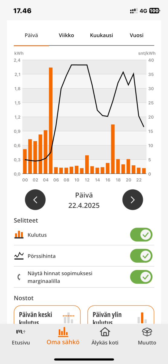 Täällä myös.Kuvassa tiistain käyrä. Täällä on kulutus minimissä kalleilla tunneilla.