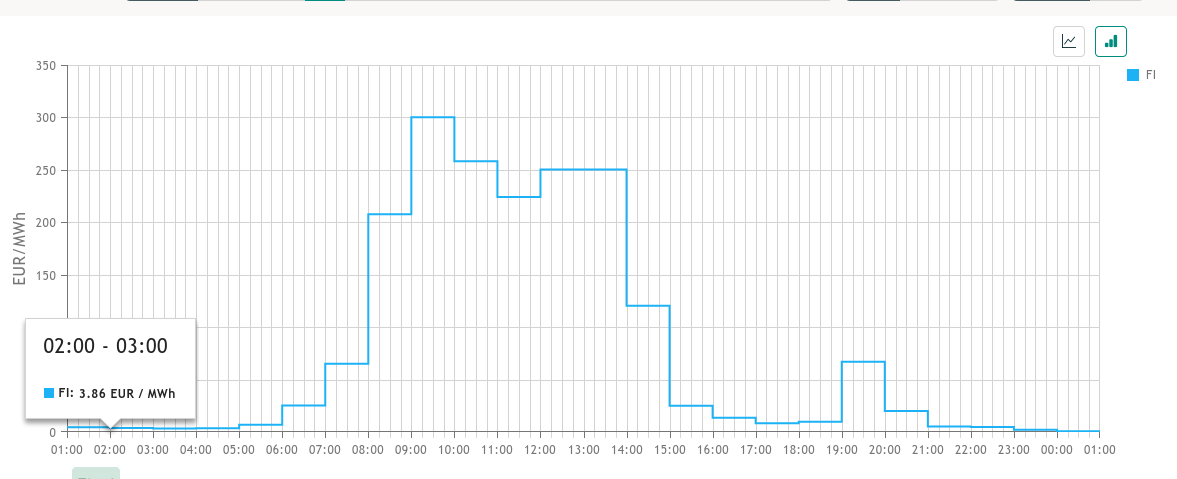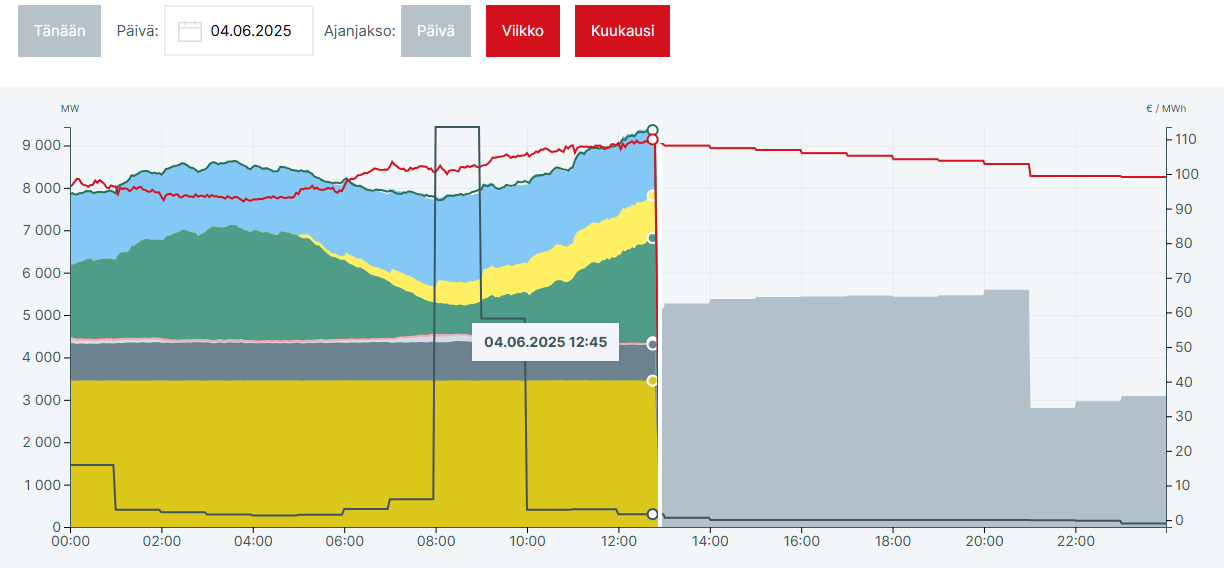 Kyllä tässä näkyy se, että kesäaikana Suomessa sähkön kulutus olematonta ja aurinkovoima alkaa kasvattamaan osuutta. Lyhyt vikailmoitus nostaa hintaa hitusen ja pitkäkin vain vähän.
