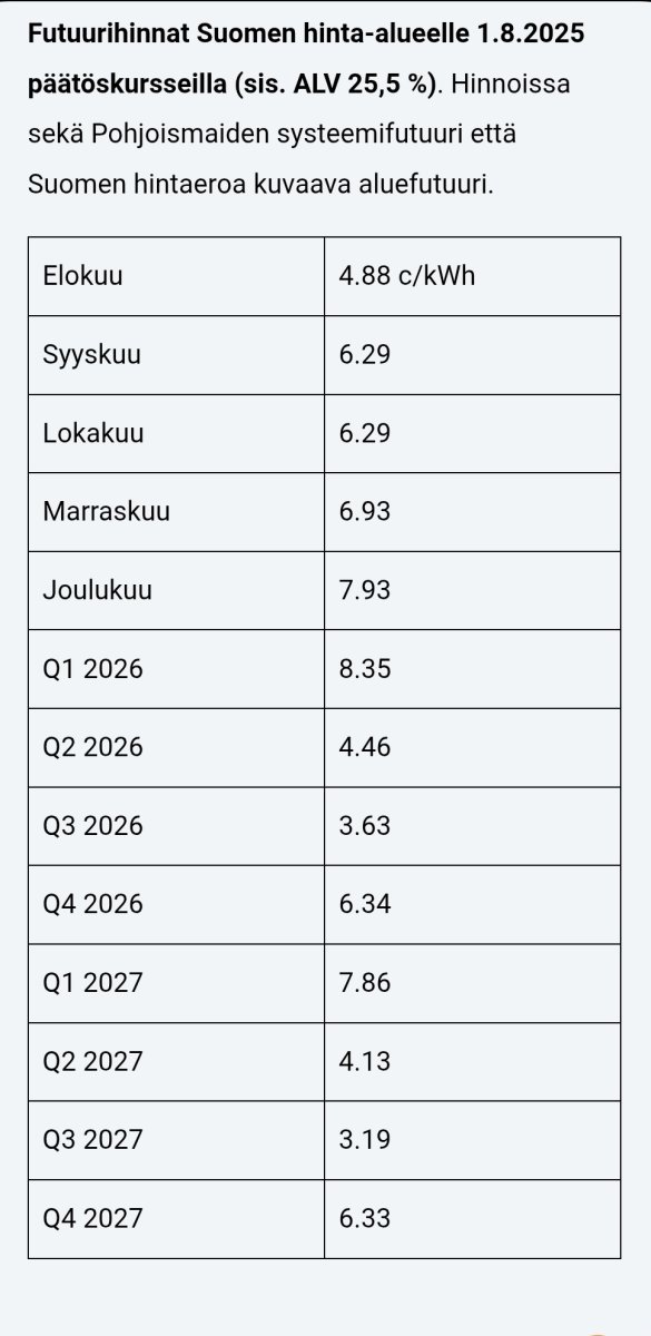 Syksyn tuntua kun pörssihinnat karkaa taas mukavan korkealle. Juuri sopivasti saunapäivä :cool: ja Helenin kiinteä 6,55 snt alkoi tänään 1kk 10pv pörssisähkö kokeilun jälkeen.
