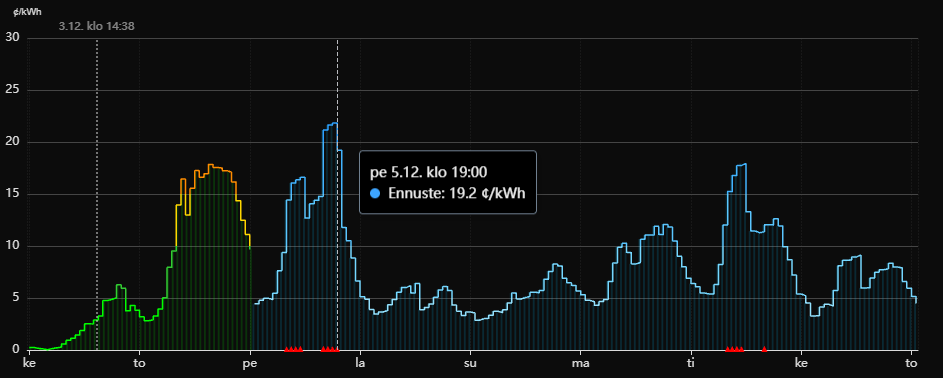 Itse veikkaan 5-10c korkeampaa keskihintaa kun yökin tulee olemaan kallis ja pohjois-ruotsissa on räkätyyntä ja juoksutusrajoitukset päälläPerjantaina piikitellään ilmeisesti vielä lujempaa, no keskihinta taitaa silloinkin asettua samalle tasolle huomisen kanssa.