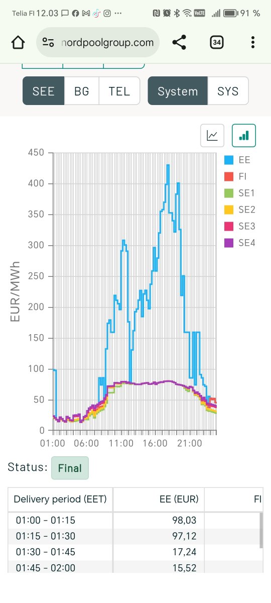 Erityisesti pohjois ruotsissa tyyntä mikä nostaa SE1 hinnan poikkeuksellisenkin kovaksi ja ollaan samassa hinnassa. Tässä tilanteessa pitäisi olla kotimaista tuotantoa vielä n. 3000mw lisää jotta saataisiin Aurora täyteen ja irtaannuttaisiin SE1 hinnastaLaitan tämän tähän.