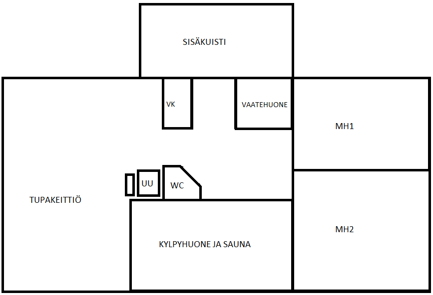@Tata ja muut. Tässä hirveä pohjapiirros talosta. Mutta suunnilleen tollainen se on. Eli sisäkuistin oven yläpuoli saattaisi olla hyvä paikka. Onhan se muuten aika kapea käytävä, toisella puolen on vaatehuone ja toisella vaatekomero, mutta ei sitä siihen varmaankaan nyt sitten voi laittaa, koska toisinpäinkään se ei siihen voi laittaa, koska puhaltaisi sitten poikittina.