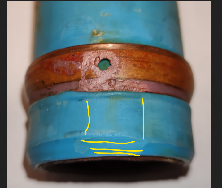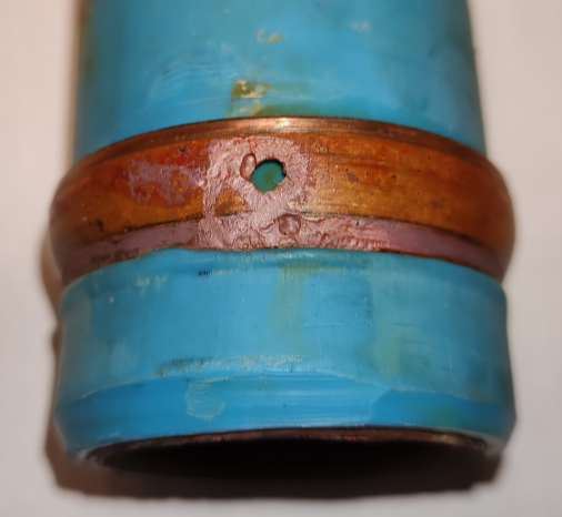 Tuolla kanssa näyttää olevan jotain syöpymää, joko vedessä ollut jotain ikävää, messinkirungon materiaalissa virhe tai jokun ylimääräinen (metalli)pala eksynyt tonne ja aiheuttanu sähköisen parin avulla syöpymistä?