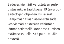 "Lämpimään tilaan asennettu sadevesiviemäri eristetään vähintään lämmöneristeellä kondensoitumisen estämiseksi, ellei sitä palo- tai äänieristetä."