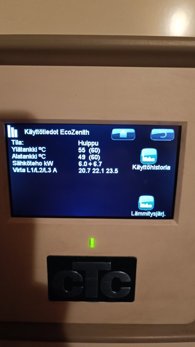 Ei saunota tuntikausia. Joo eihän sitä tiedä milloin kukin saunoo niin äkkiäkös sitä kovalla pakkaskelillä molemmissa asunnoissa saatetaan laittaa illalla sauna päälle ja juuri kun CTC sähkövastukset on laulamassa. Jostain syystä vaikka saunat eivät ole päällä eikä auto latauksessa niin 6kw+7.8kw on ollut talvella maksimi mitä olen tuossa näytöllä havainnut eli ei silloinkaan saisi 15kw kerralla käyttöön. Tämä olisi kanssa tärkeä, kun saunojen ja suihkujen jälkeen nopea varaajan lämpötilan nosto olisi tärkeä asia huomioiden kovalla pakkasella tapahtuvan 10kw jatkuvan kulutuksen niin ei paljon jää suihkuvedelle vastustehoa kun patterit syö samaa tahtia melkein energian kuin sitä varaajan taiotaanMiksi niiden pitäisi olla yhtäaikaa päällä? Onhan 3x35 A niukasti kahteen asuntoon, mutta ei kai kämppää tarvitse lämmittää kiukaan ollessa päällä. Eikä varsinkaan sähköautoa ladata. Vai saunotaanko tuntikausia päivittäin? Saunoessa olisi tietysti kiva olla lämmintä vettä. Mutta riittäähän tuo 25 kW kiukaaseen ja vastuksiin. Kai se VILP sentään melkein aina käynnissä on eli ei tarvita ainakaan täyttä vastustehoa.