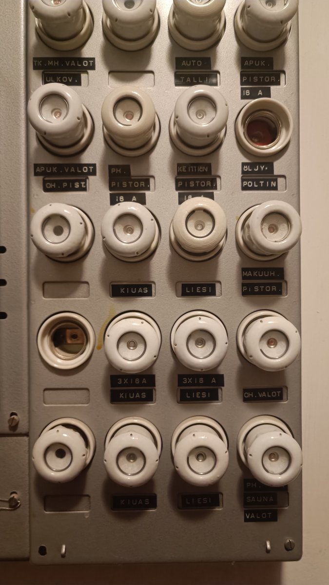 Kai tuo sitten on jo niin vanha keskus että tyyppikilpeä ei ole vielä tuolloin vaadittu... Tai vaan pudonnut. Yleensä se kyllä on noissa vanhoissakin.Meillä on kiinteistömuotoinen paritalo ja molemmilla omat sähkösopimukset. Naapurissa on nuo pääsulakkeet tosiaan ja hänen tauluunsa kytketty vilp vastuksineen. Täytyykin selvitellä miten tuo vilp vastuksineen on kytketty. Muistelisin, että on 25a takana. CTC sisäyksiköm näytöltä näen, että pääsulakkeeksi on ilmoitettu 25 ja sitä pystyy muuttamaan itsekin. Kuvat omasta ryhmäkeskuksesta liitteenä + kaksi vanhaa kuvaa naapurin puolelta josta en nyt parempia kuvia tähän hätään saa. Omassani ei tyyppikilpeä tai mitäön tietoa näy.