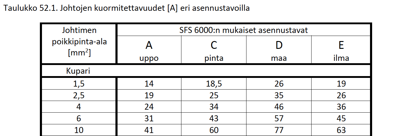 Taulukko on ”turvalliseen suuntaan” yksinkertaistettu taulukko niin, että arvot pätevät PVC-eristeisille 3-vaihepiireille. Arvoja voidaan käyttää myös yksitäiseen johtoon. Lisäksi ilmajohdot on 25C ja lämpötilojen perusteella on korjauskertoimet eli alapohja viilentää johto 10%. Maa-ainekselle on myös korjauskertoimet.