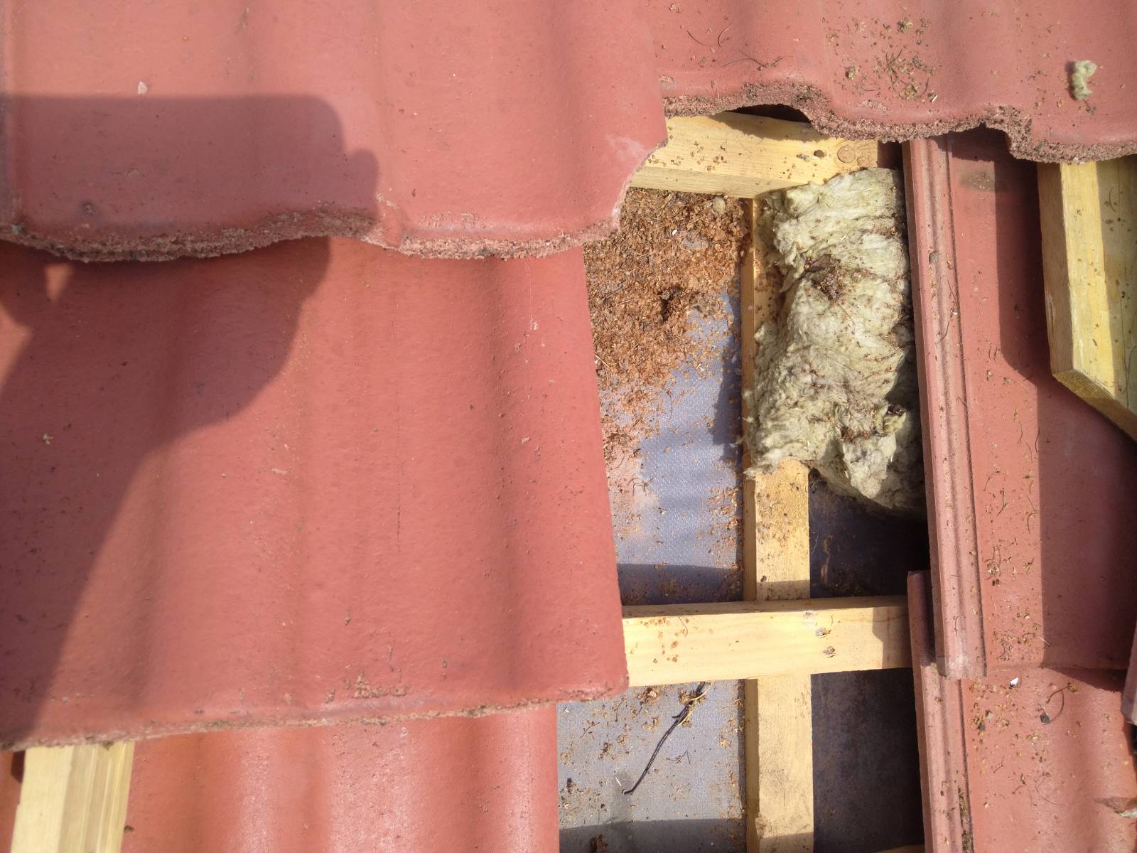 Ei ne on tungettu sinne, väli täyteen. Oskohan aluskate pigotettu ette lepata tuulessa?En keksi mutta jospa tiilet ovat jääneet väärälle tasolle toisiinsa nähden? Tai jos ei ollut ruoteen ja tiilen välissä, niin joku elukka on ollut pesänrakennuspuuhissa?