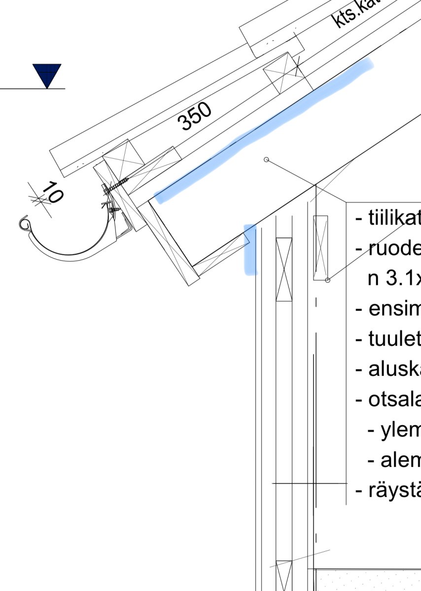 Mulla aluskate on vielä hiukan vajaa räystäältä. Käsittääkseni sen takia että mahdollinen kondenssivesi ei valuisi räystäslautoihin. Tämä kuva ei ole omasta talosta, mutta ratkaisu on itsellä vastaava ja räystäät aavistuksen pidemmät.Kovin on tosiaan lyhyt räystäs ja vähäiset tuuletusraot. Kyllä siellä silti ilma tuntuu liikkuvan (sekä ullakolla että aluskatteen ja päällyskatteen välissä) eikä muita kosteusongelmia ole ullakolla havaittu. Molemmilla lappeilla tuota on ollut.