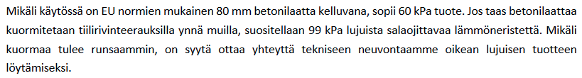 Ei varmasti ole tulossakaan. Kyse on edelleen siitä 80-100 mm kh lattiasta. Siitä tulee ehkä 3 kPa painetta ja noissa puhutaan helposti 10..20-kertaisista kestävyyksistä. Sitäpä tässä juuri selvittelen asettaako tuo minkäänlaisia vaatimuksia puristuskestävyydelle...…sitten ei voi käyttää maksimikuormitusta…