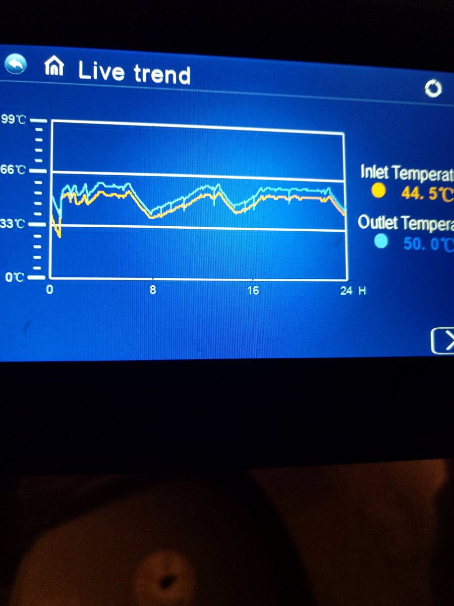 ei muutettu mitään, vain lattiakierron pumpun nopeutta hidastettiin. Eli Vilpin pumppu kovalle ja lattialämmityksen kierron pumppu hitaalle. Tämä auttaa siihen, että vesi ehtii luovuttamaan lattiaan lämpöä ja siten palaa pumpulle matalammalla lämpötilalla takaisin. Meillä tänään ollut pumppu päällä koko päivän noin 30-40 hertsin nopeudella.