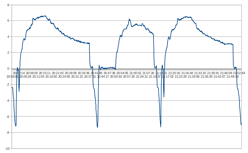 Aika kivasti on pysynyt vastukset poissa päältä, sen kyllä näkee kun ne kiskaisee ylemmän anturin käyrää ylös. Eihän niitä vastuksia tietenkään näin lämpimällä enää tarvitsisi, mutta kun ne on jätetty päälle niin Nibe ohjaa niitä itse tuon ylemmän anturin kanssa samassa kolossa olevalla omalla anturillaan. Mutta hyvin on pysyneet pois päältä kelin lämmettyä.