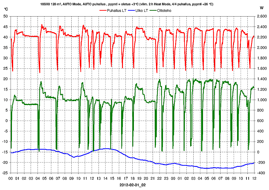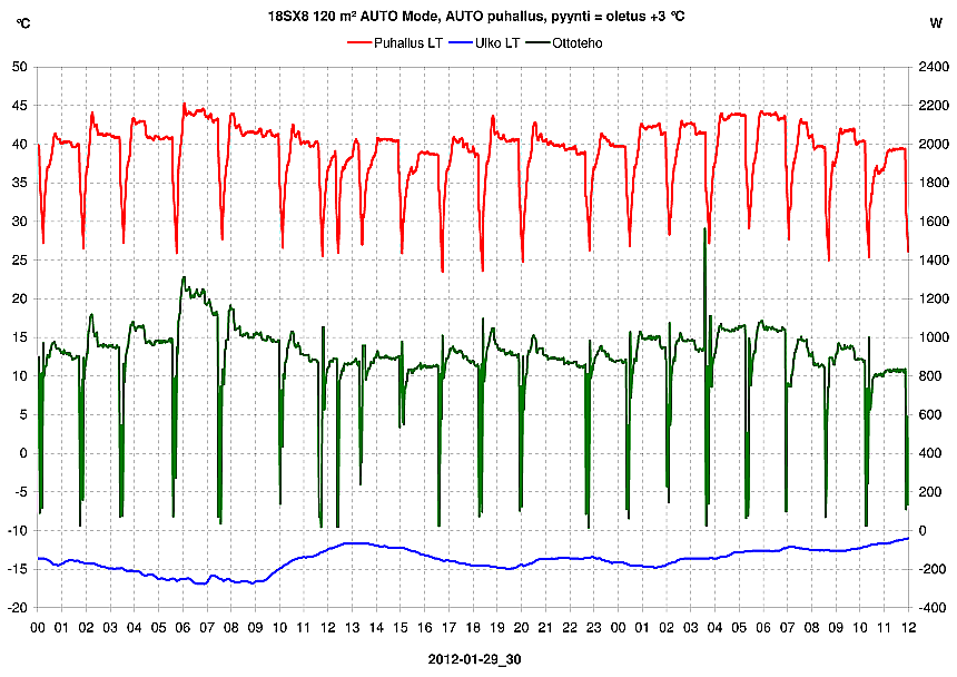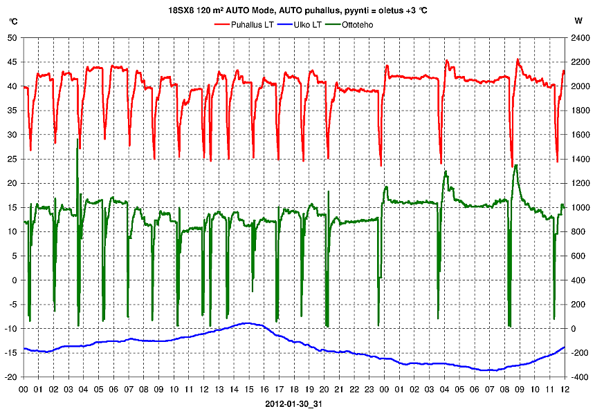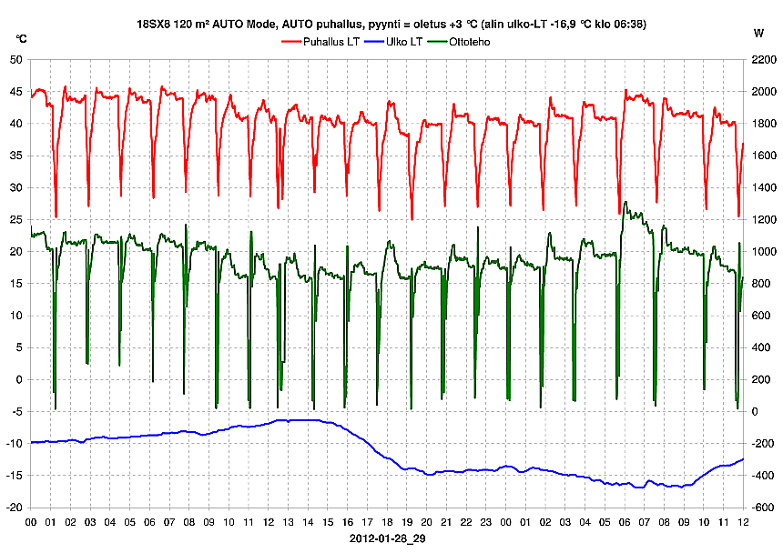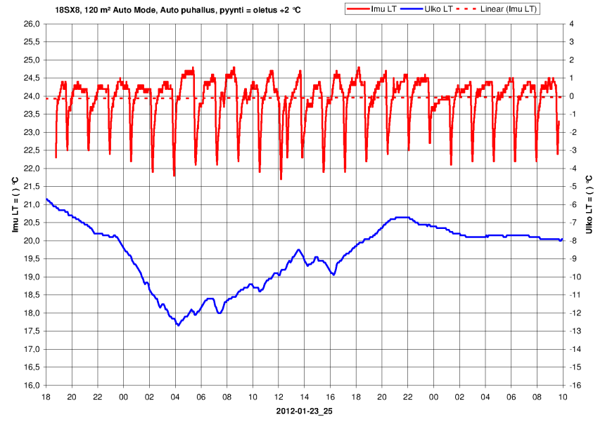 RAFU sanoi:P.s. Ilmalämpökoneen iso tuuletin vie 0,7 A 25 Hz taajuudella cos fi 0,75. Lisäksi siellä on kaksi pienempää joita normaalisti ajetaan minimikierroksilla, ehkä 50 W yhteensä.